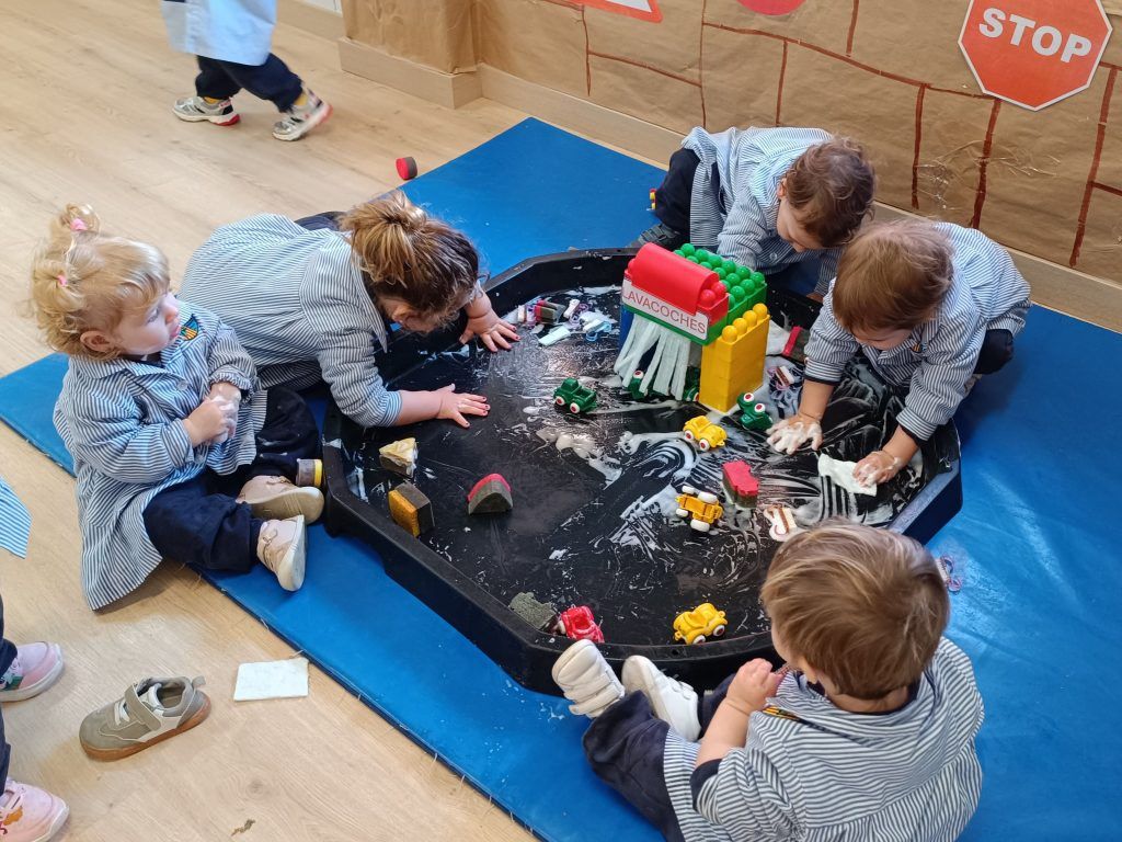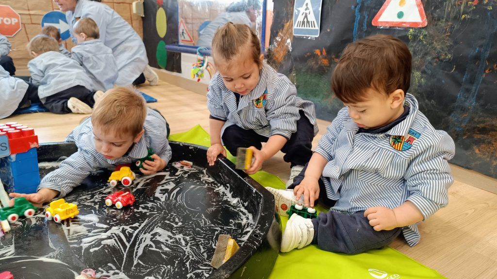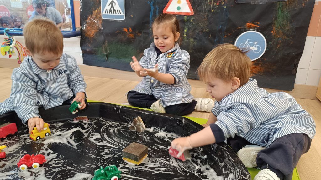 Las esponjas absorbían el agua, la espuma aparecía suave y blanca, y los coches dejaban caminos dibujados sobre el jabón. Las manos se deslizaban, apretaban y frotaban y se impregnaban de jabón. Algunos limpiaban rueda por rueda; otros descubrían que podían hacer “carreteras de espuma” con sus deditos.