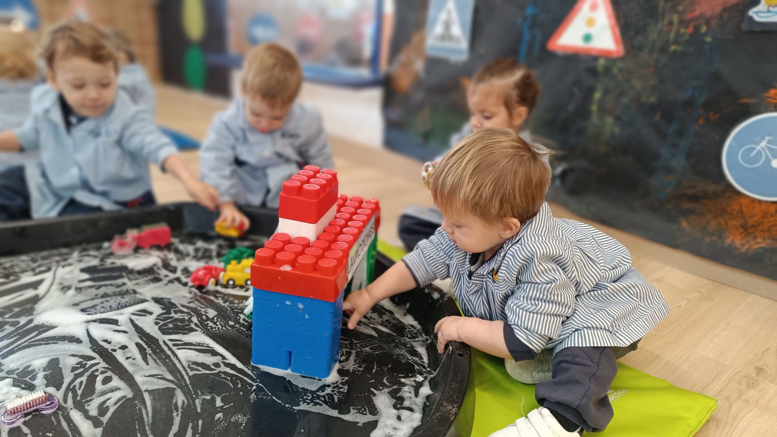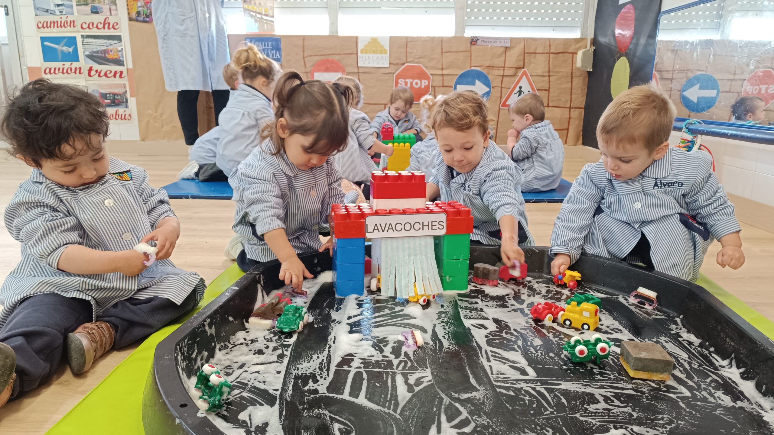 Las esponjas absorbían el agua, la espuma aparecía suave y blanca, y los coches dejaban caminos dibujados sobre el jabón. Las manos se deslizaban, apretaban y frotaban y se impregnaban de jabón. Algunos limpiaban rueda por rueda; otros descubrían que podían hacer “carreteras de espuma” con sus deditos.
