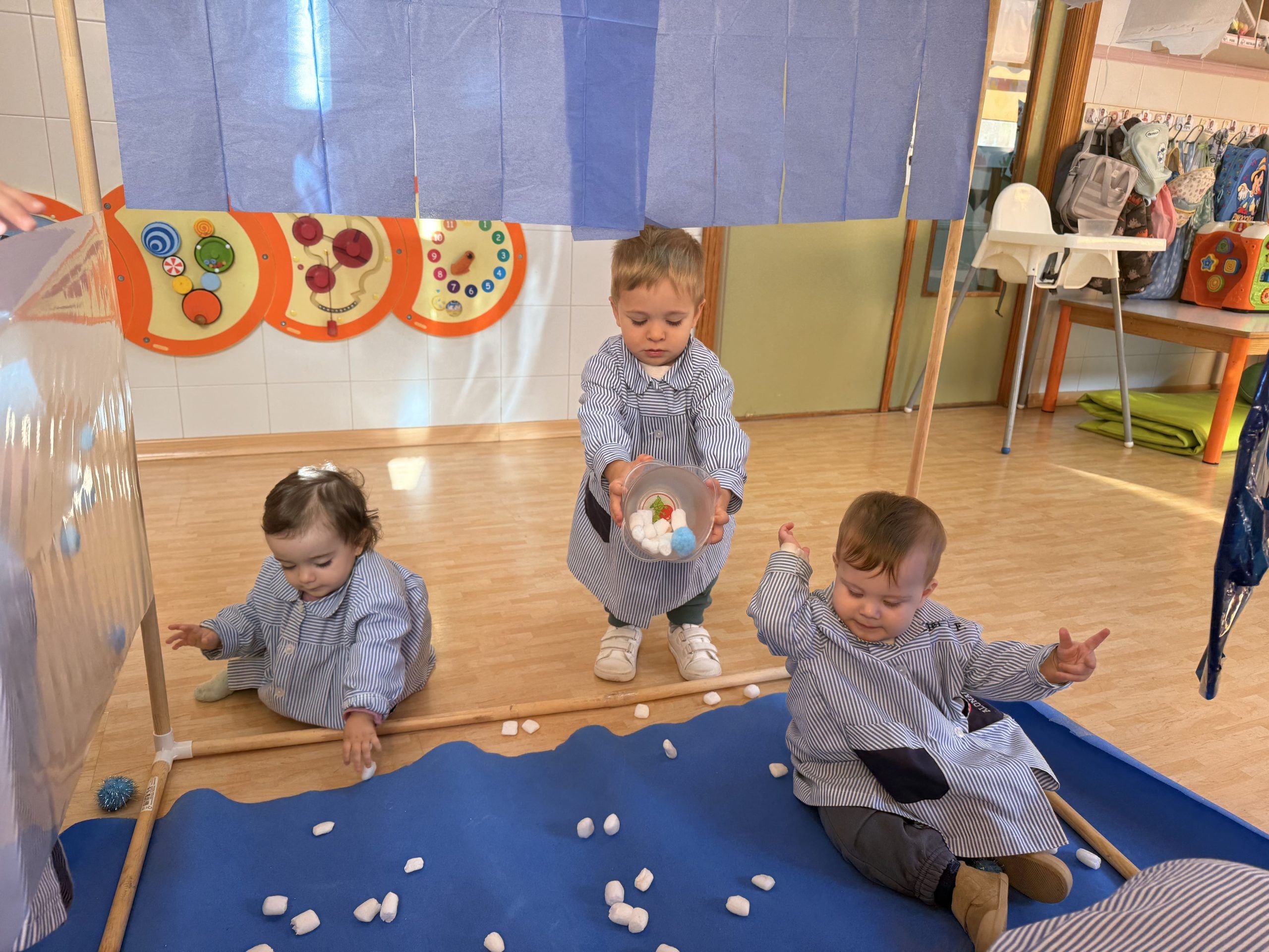 El viento ha soplado y el frío ha llegado al aula de primeros pasos en forma de “cubo de hielo” y “bandeja sensorial nevada” donde nuestros peques han podido vivir diferentes experiencias a través de las tareas propuestas.