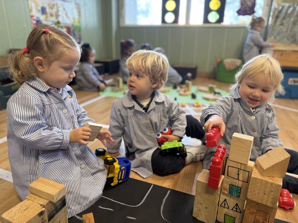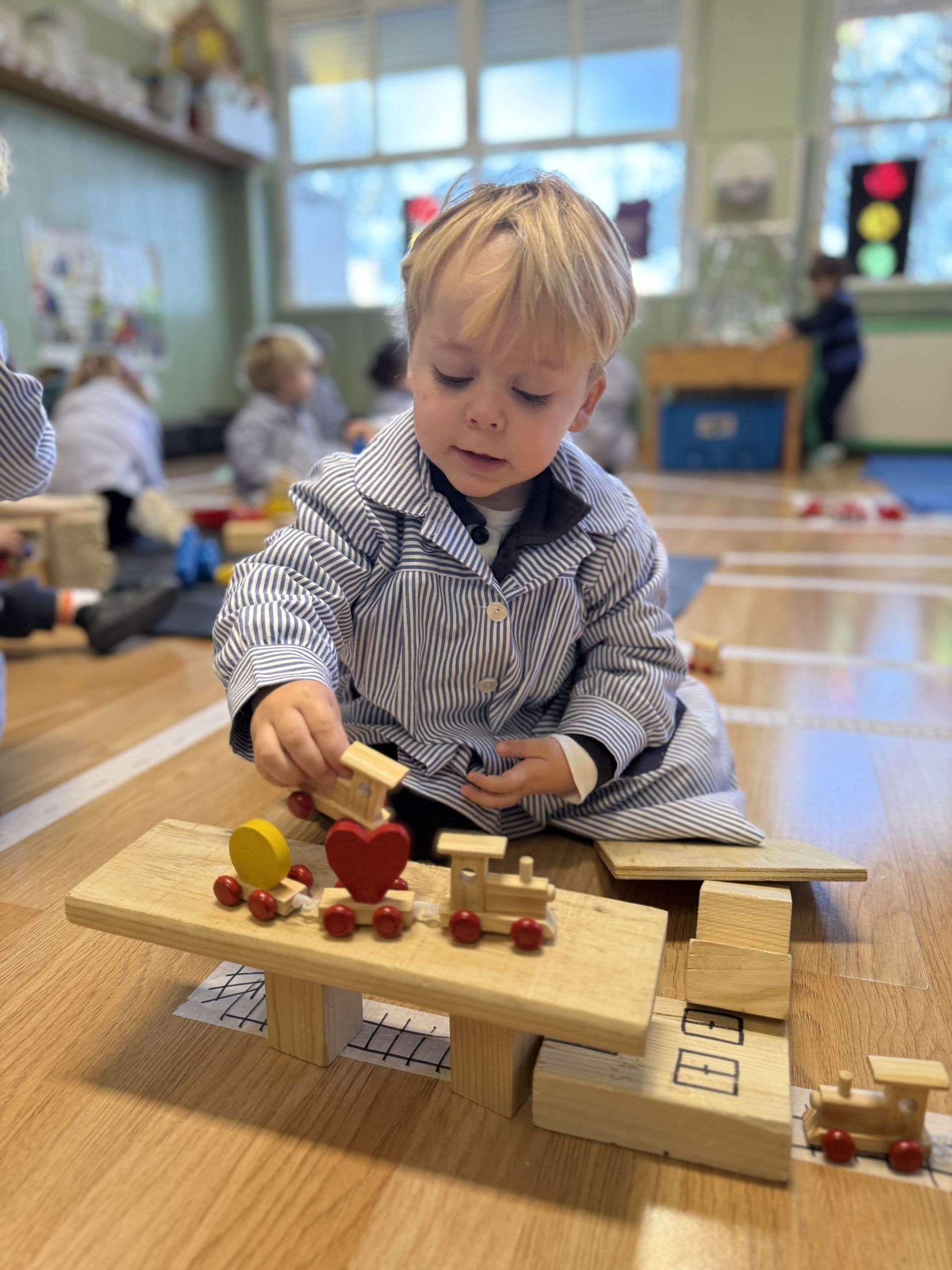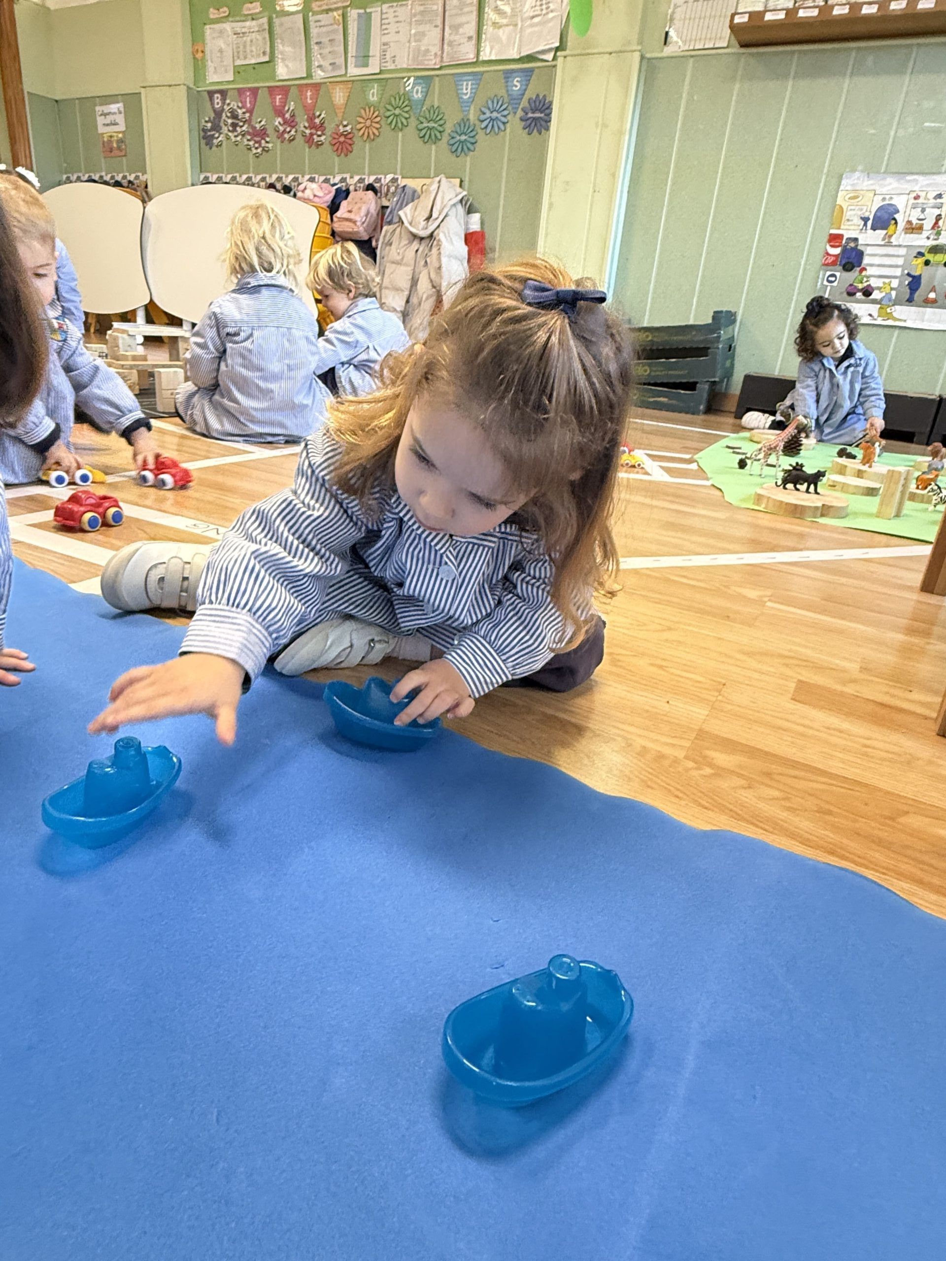 Creamos tres ambientes de juego bien diferenciados —la ciudad, el bosque y el mar—, todos ellos conectados por una red de carreteras y vías por las que circulaban coches, camiones y trenes. Con materiales sencillos y cotidianos como bloques de madera, construcciones, vehículos y telas, los niños y niñas encontraron un espacio abierto a la exploración y la imaginación.