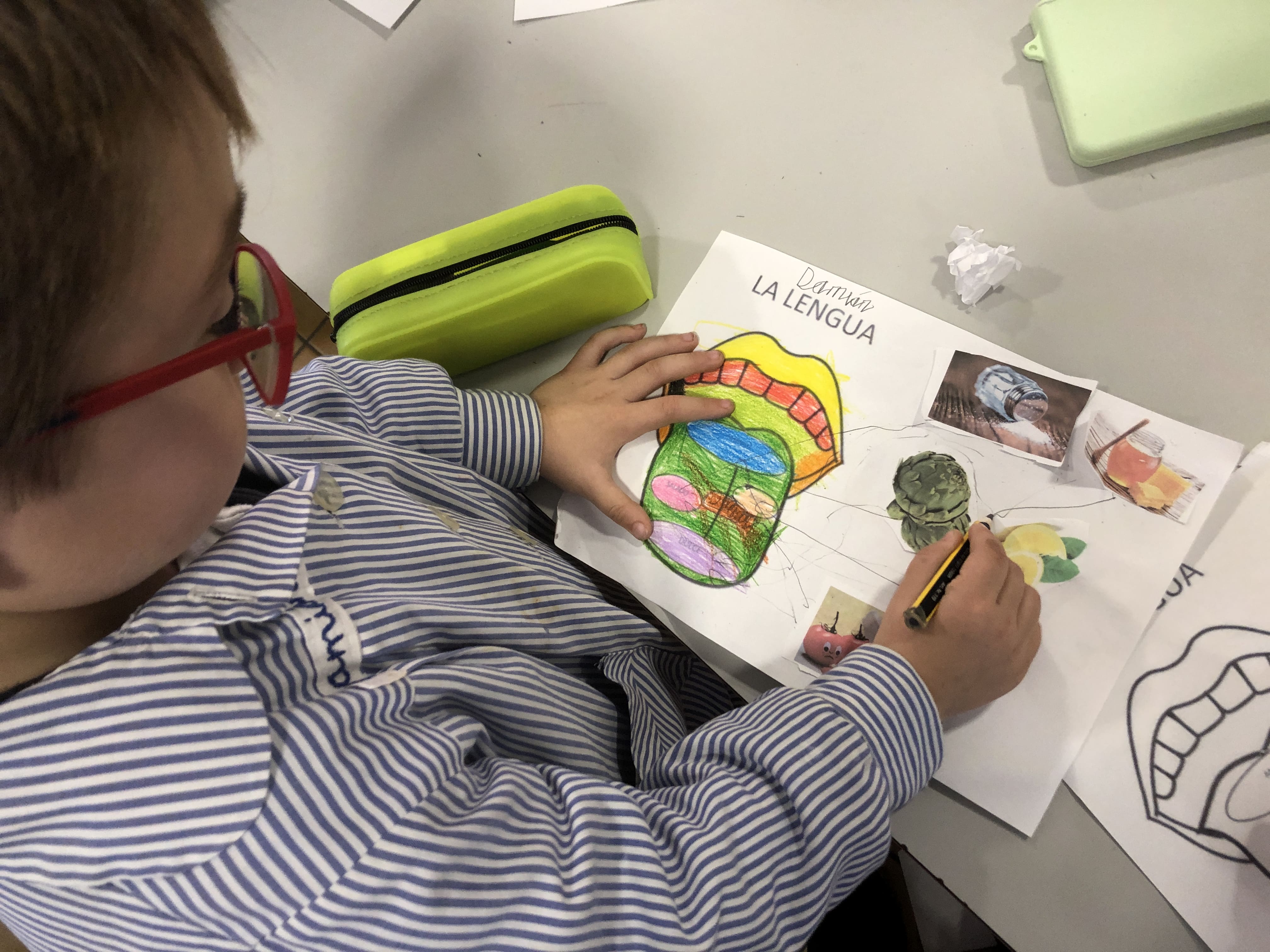 Pero, una de las actividades que más nos ha gustado, ha sido experimentar con los diferentes sabores. Para ello, probamos diferentes alimentos y texturas como: el limón (ácido), patatas fritas (salado), galletas (dulce), …y hemos aprendido que en la lengua hay cinco zonas dónde se detectan cada uno de ellos, gracias a unos grandes receptores como son “las papilas gustativas”.