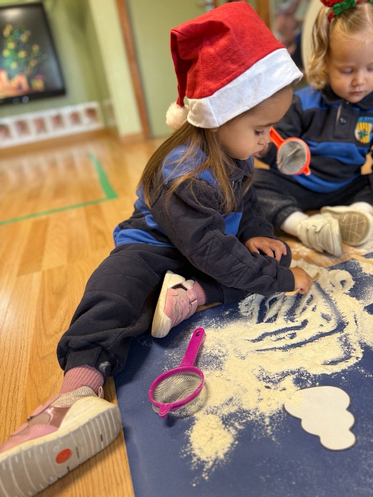 Hemos decorado el espacio con motivos invernales y navideños: árboles, estrellas, copos y pequeños detalles que aportan calidez en medio del frío. Pero sin duda, lo que más ha emocionado a los pequeños/as ha sido poder jugar con “nieve” manipulándola con cucharas, coladores y sus propias manos, experimentando su textura y sensaciones nuevas.