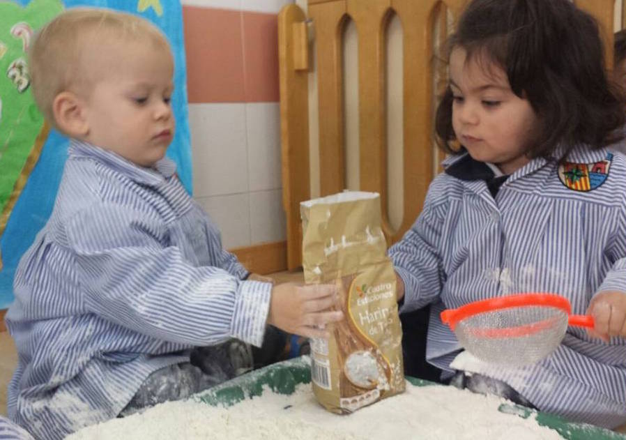 Los niños de un año lo han pasado en grande jugando con harina. El pasado martes disfrutaron experimentando con diferentes objetos que llenaban y vaciaban de harina: coladores, palitos, coches, vasos, etc. y por supuesto tocando la suave y blanca harina con las manos, incluso metiéndose de lleno dentro del montón de harina experimentando con el cuerpo.