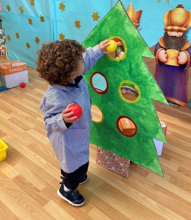 También pintamos con esponjas dos abetos navideños para realizar ¡un divertido juego! lanzamiento de pelotas para intentar encestarlas en los agujeros del mismo color. En esta actividad nuestra gran puntería provocó risas y gran diversión.