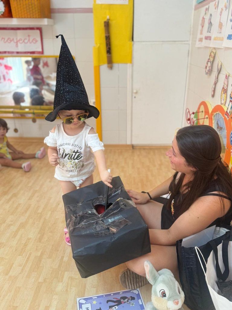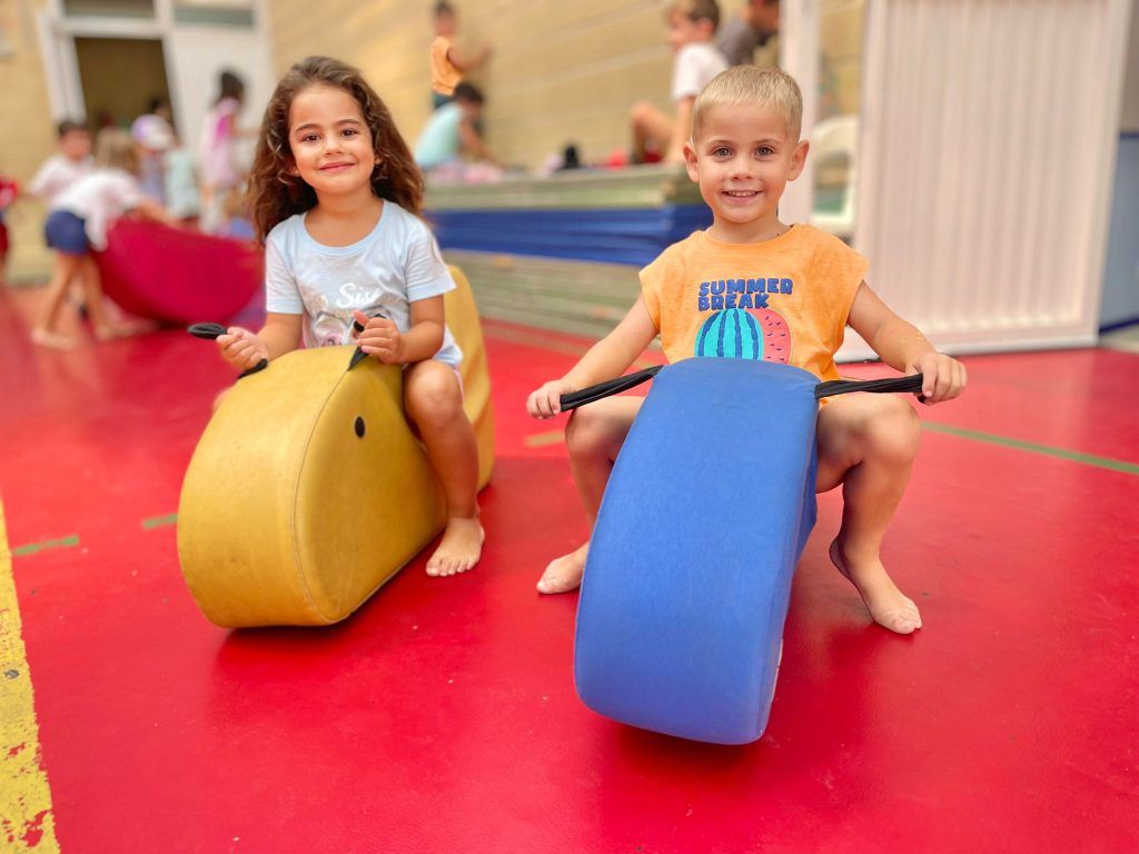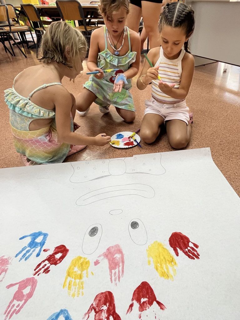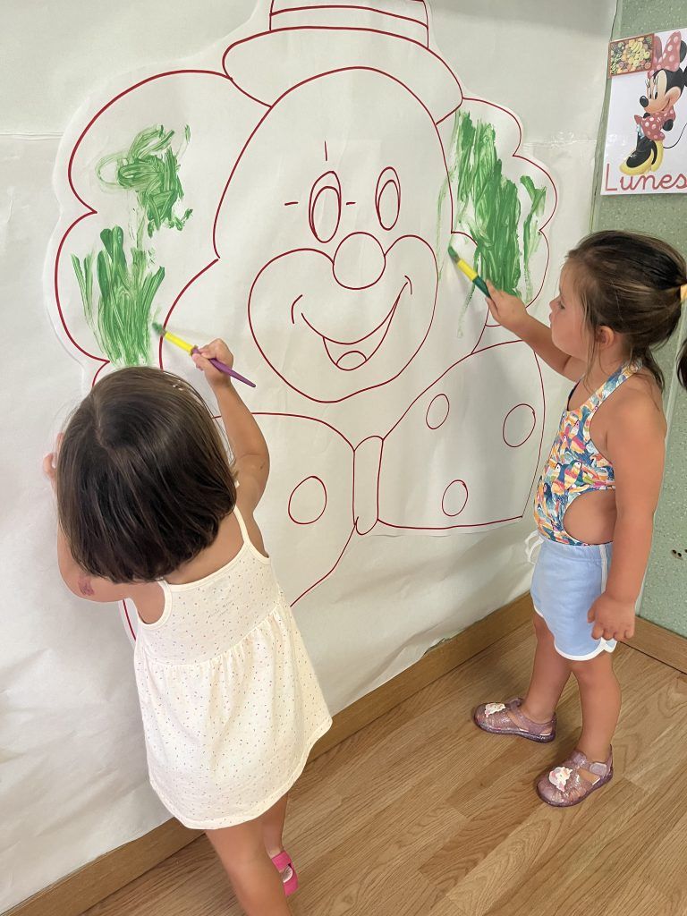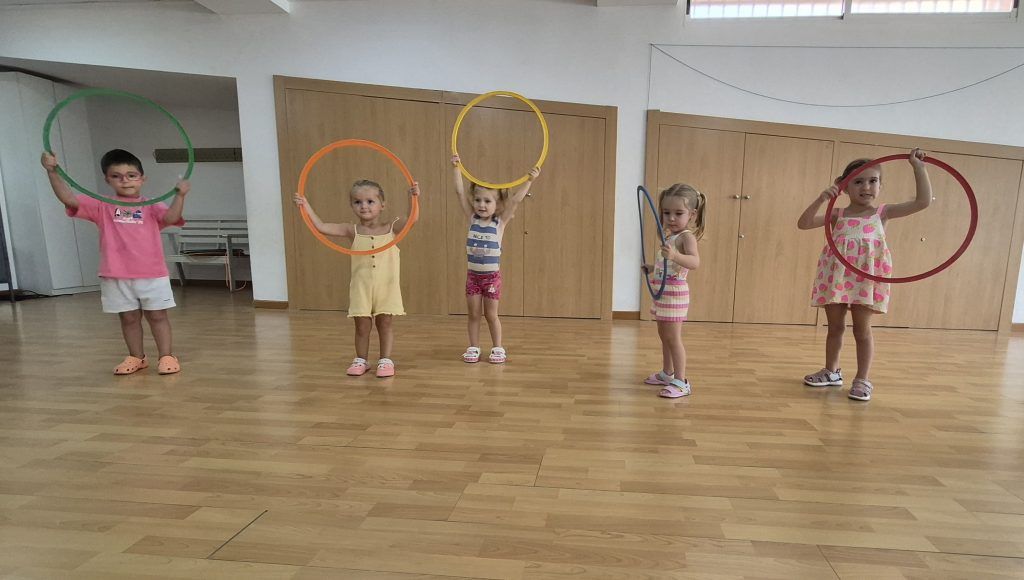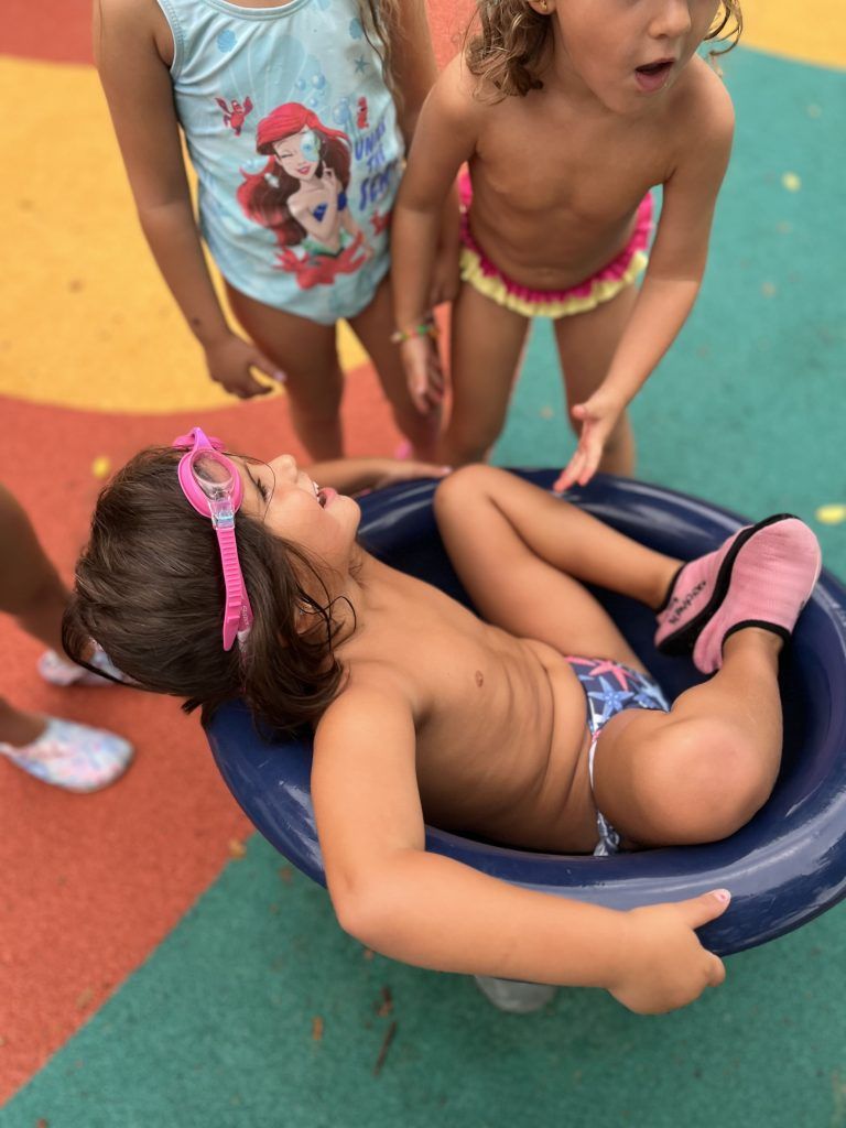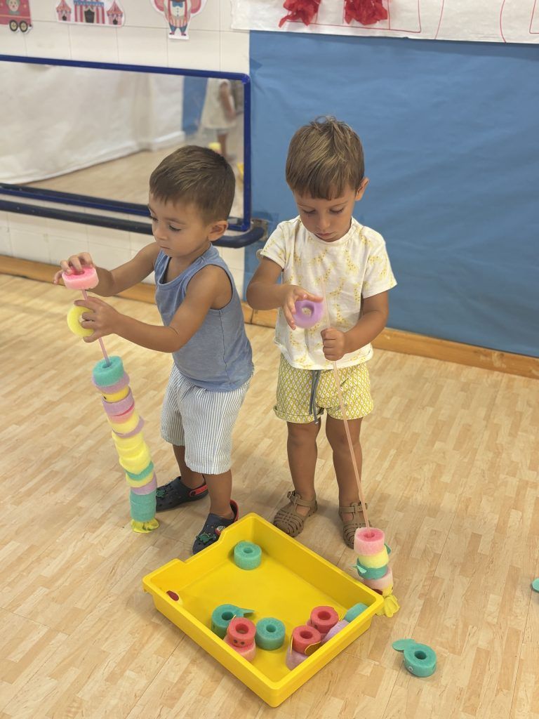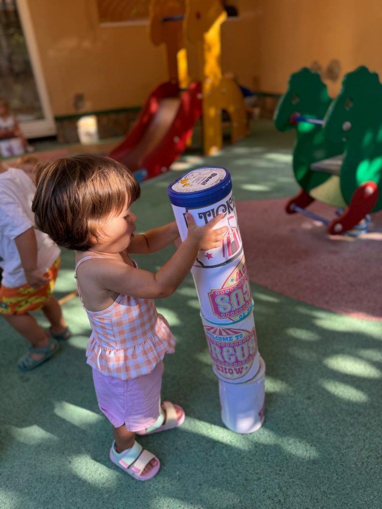 También han creado sus propias mancuernas con materiales reciclados y han experimentado con los botes del circo con los que hacen música, torres, conocen vocabulario, realizan ejercicios motrices, entre otros intereses que surgen al ser una sesión libre. Tras esto, nos refrescamos diariamente en la piscina o juegos de agua, realizamos nuestra sesión de psicomotricidad y aprendemos inglés de forma lúdica.