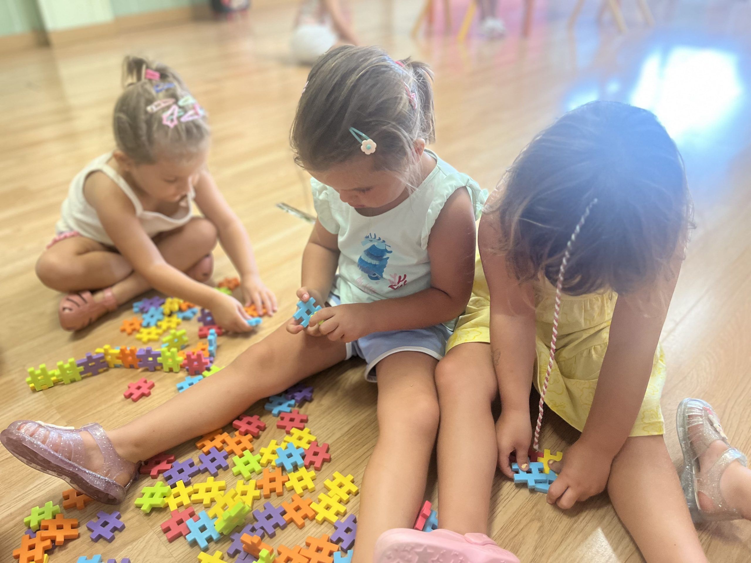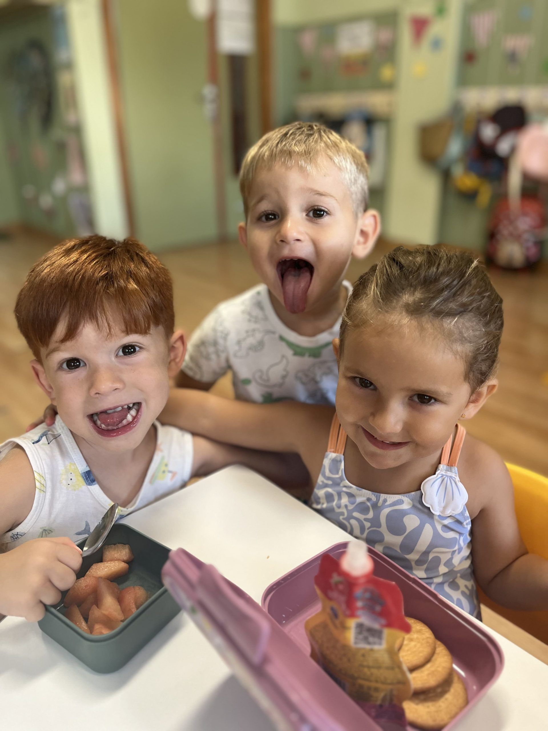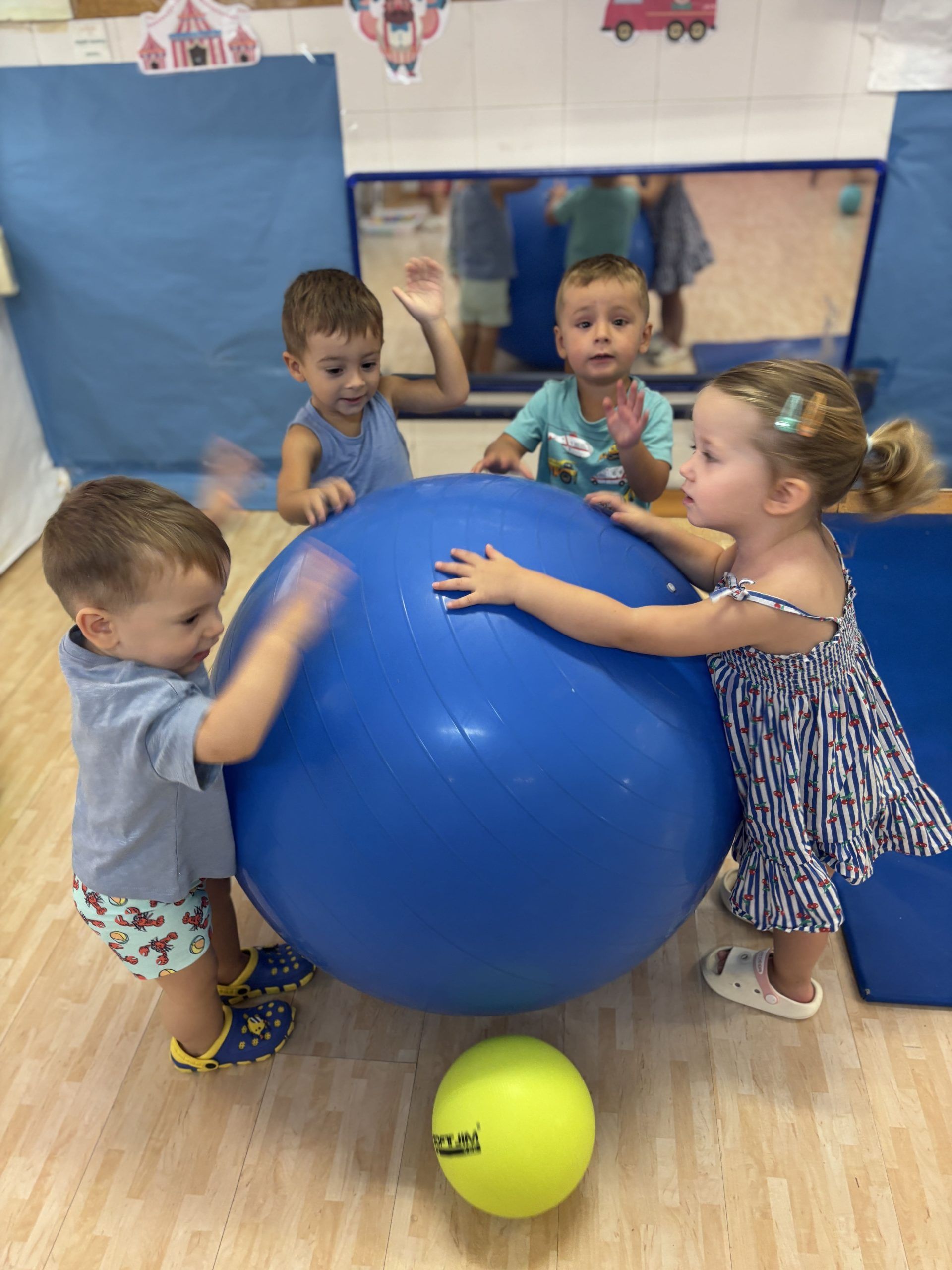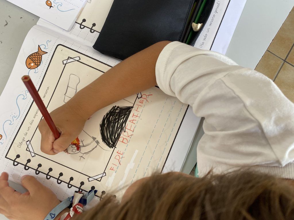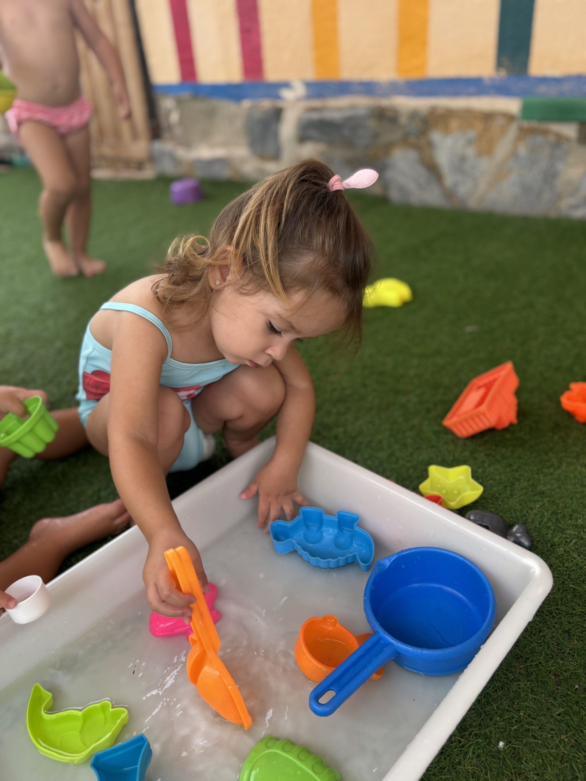 También han creado sus propias mancuernas con materiales reciclados y han experimentado con los botes del circo con los que hacen música, torres, conocen vocabulario, realizan ejercicios motrices, entre otros intereses que surgen al ser una sesión libre. Tras esto, nos refrescamos diariamente en la piscina o juegos de agua, realizamos nuestra sesión de psicomotricidad y aprendemos inglés de forma lúdica.