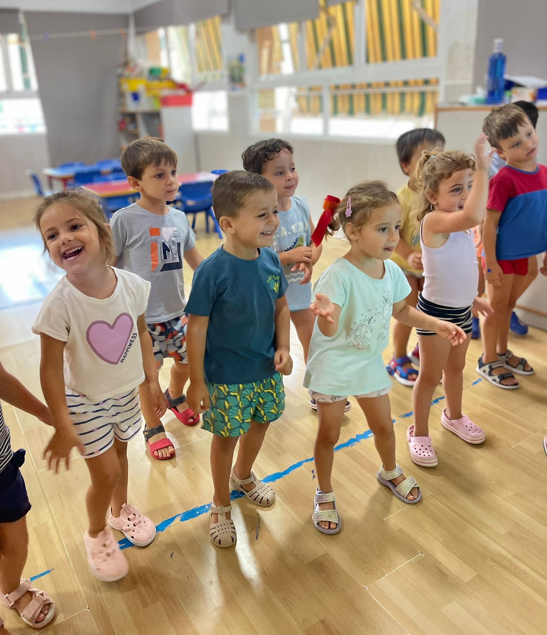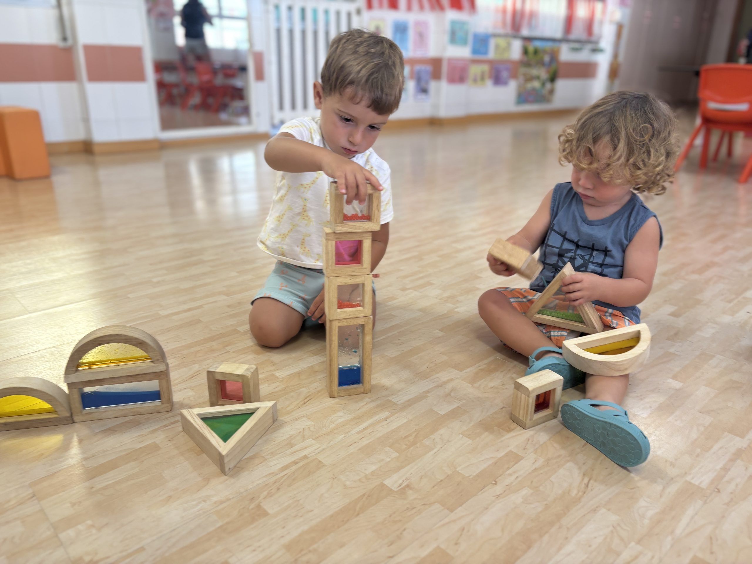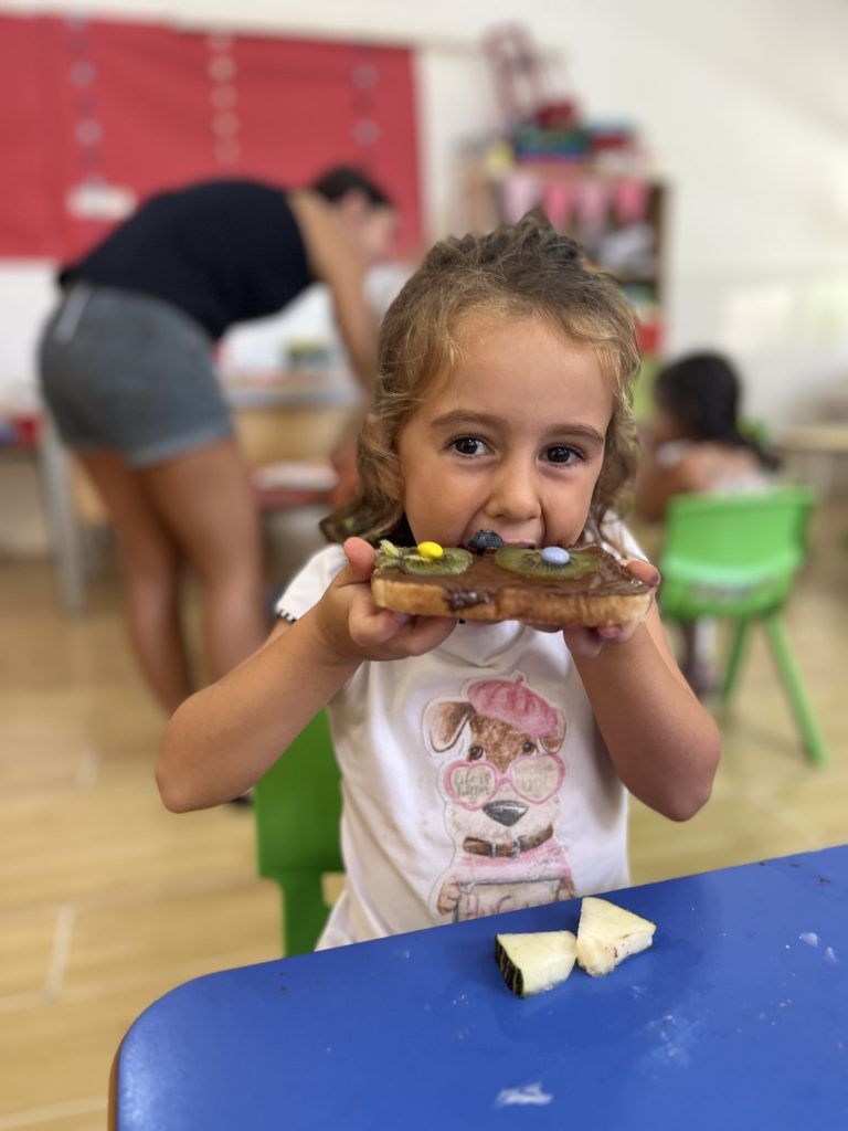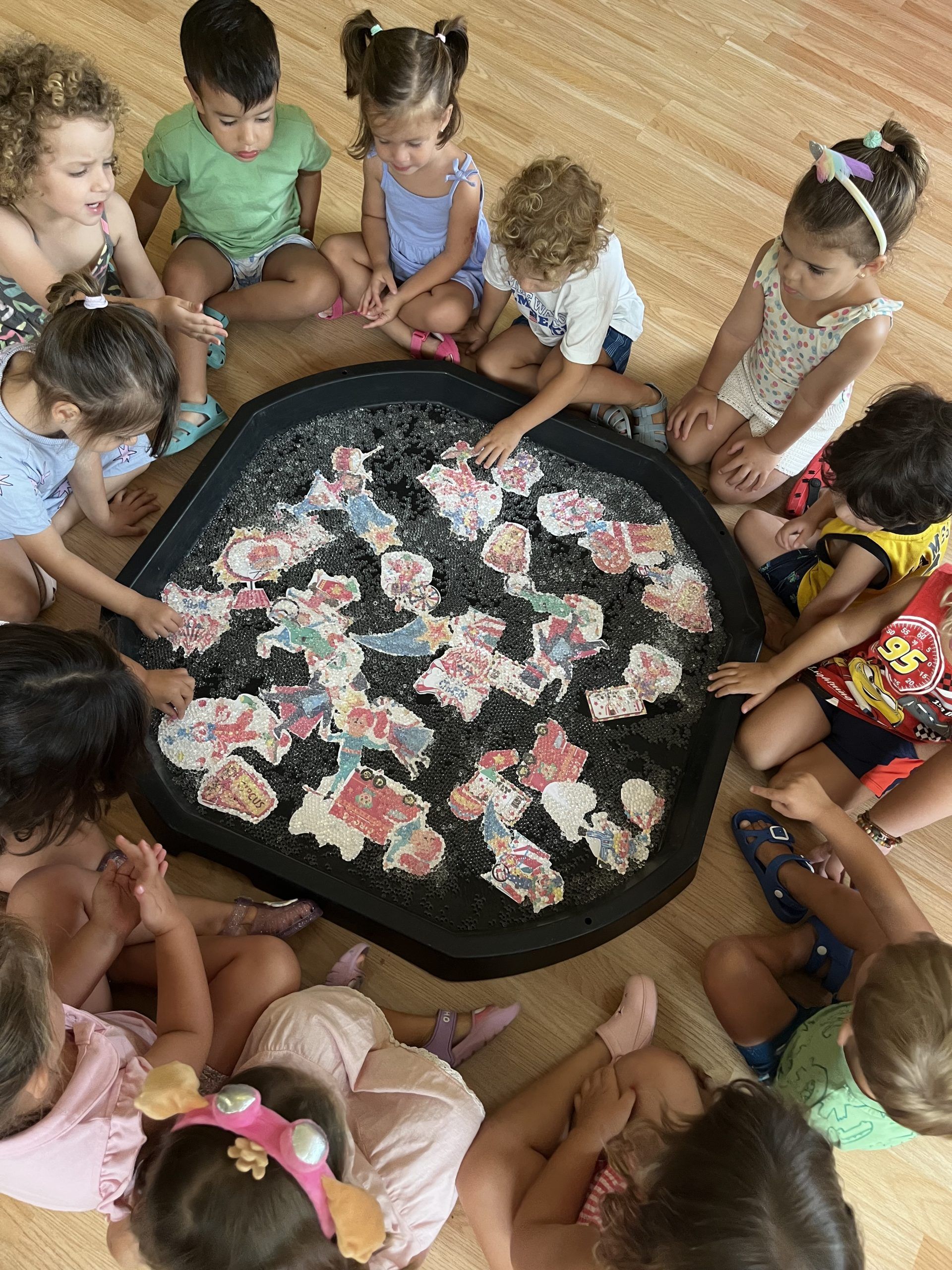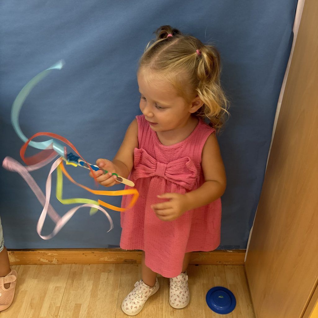También han creado sus propias mancuernas con materiales reciclados y han experimentado con los botes del circo con los que hacen música, torres, conocen vocabulario, realizan ejercicios motrices, entre otros intereses que surgen al ser una sesión libre. Tras esto, nos refrescamos diariamente en la piscina o juegos de agua, realizamos nuestra sesión de psicomotricidad y aprendemos inglés de forma lúdica.