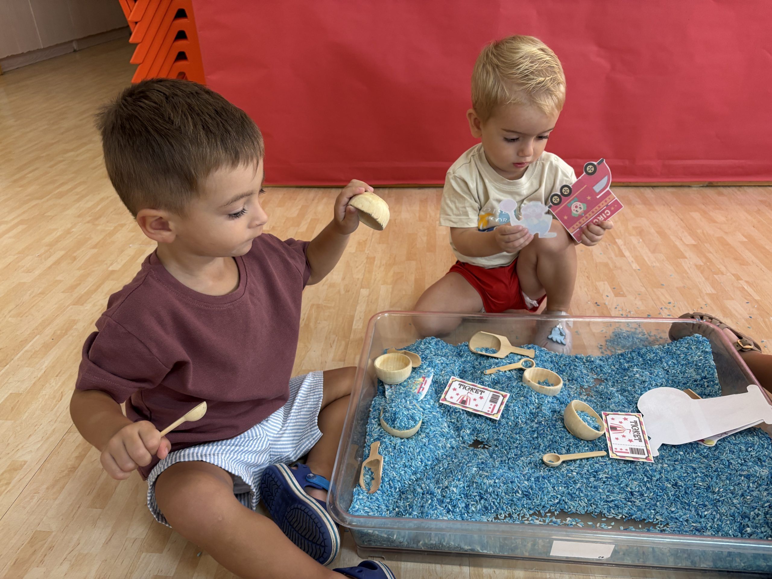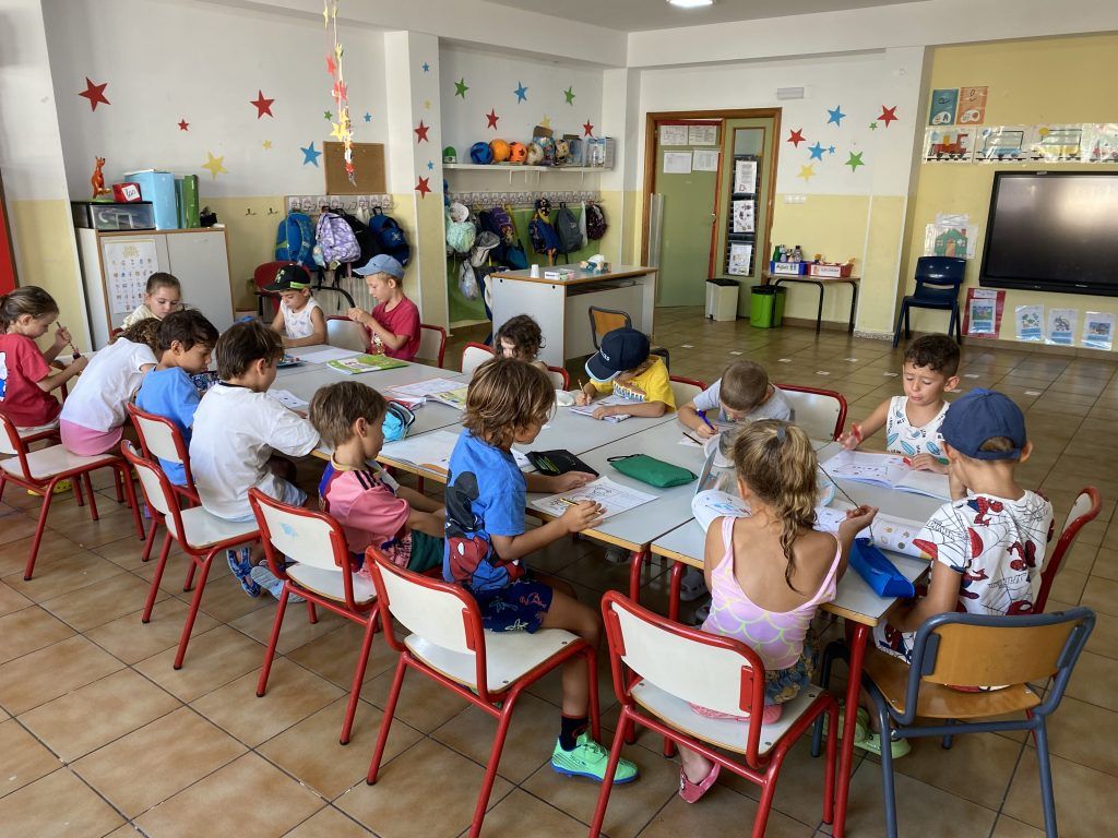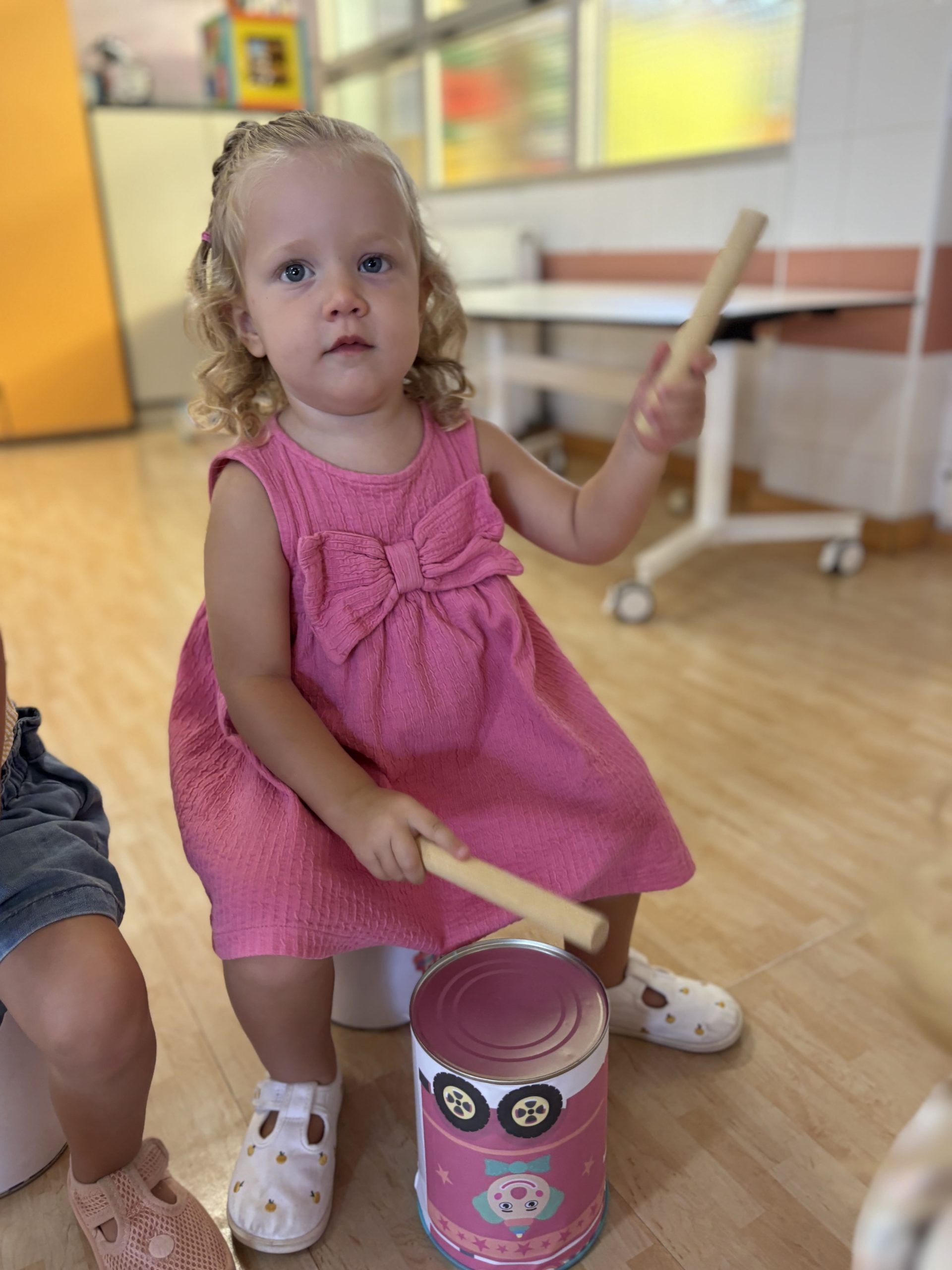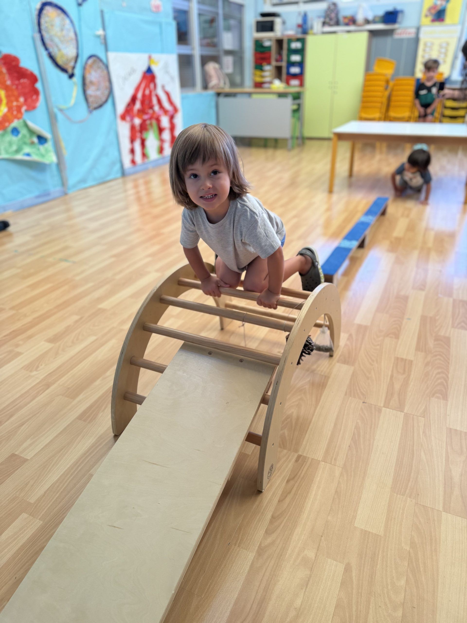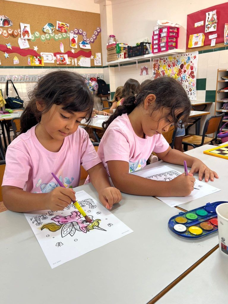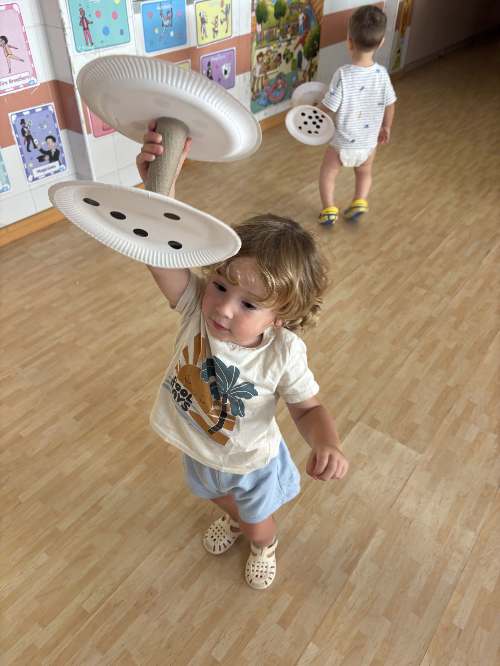 También han creado sus propias mancuernas con materiales reciclados y han experimentado con los botes del circo con los que hacen música, torres, conocen vocabulario, realizan ejercicios motrices, entre otros intereses que surgen al ser una sesión libre. Tras esto, nos refrescamos diariamente en la piscina o juegos de agua, realizamos nuestra sesión de psicomotricidad y aprendemos inglés de forma lúdica.