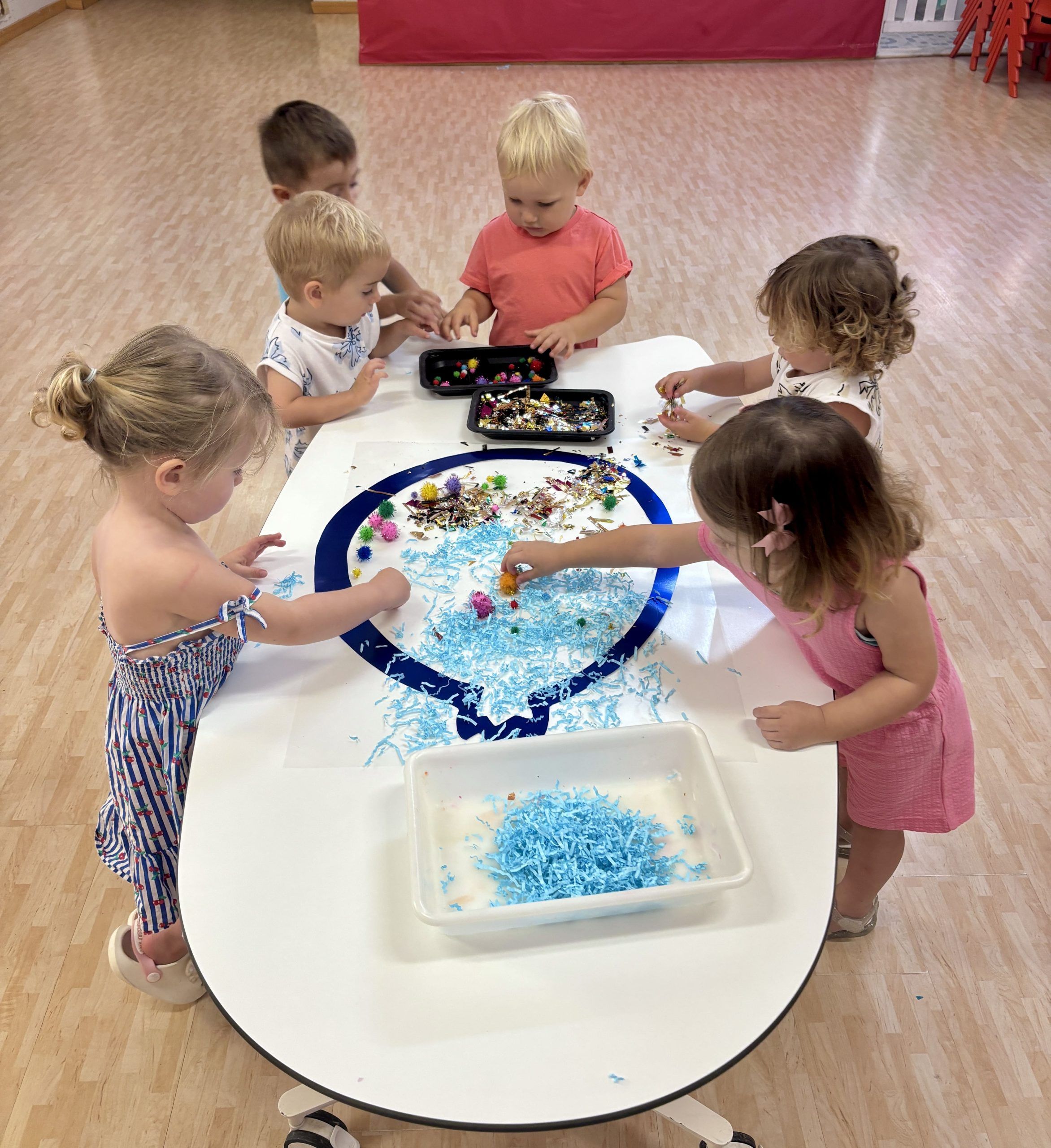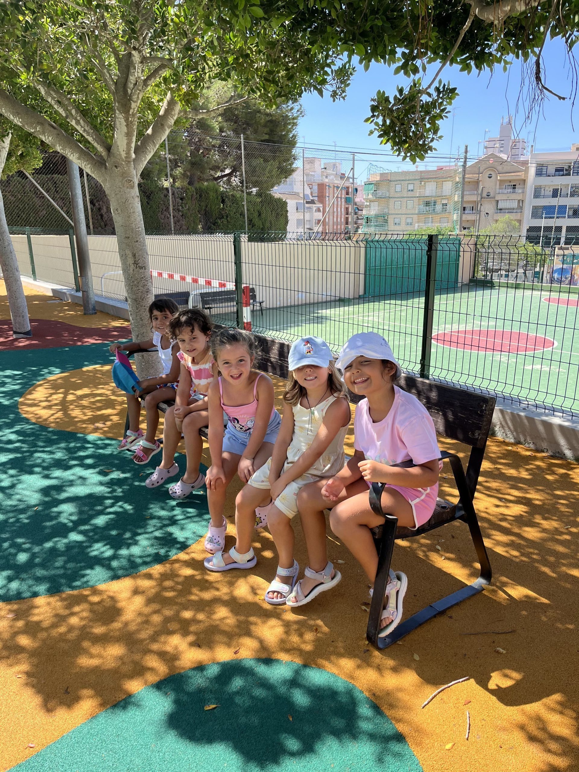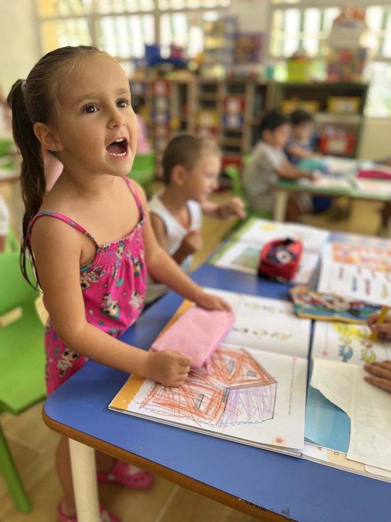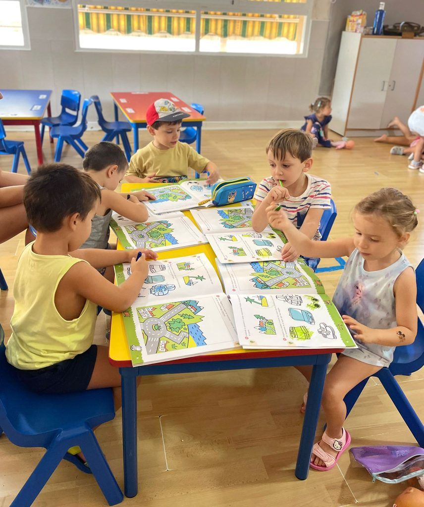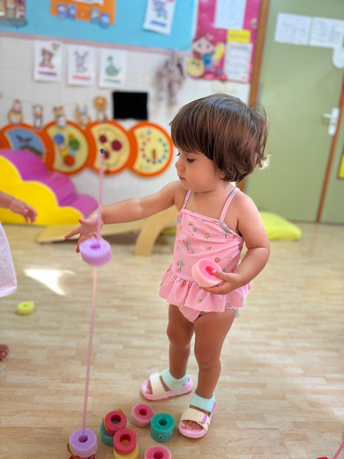También han creado sus propias mancuernas con materiales reciclados y han experimentado con los botes del circo con los que hacen música, torres, conocen vocabulario, realizan ejercicios motrices, entre otros intereses que surgen al ser una sesión libre. Tras esto, nos refrescamos diariamente en la piscina o juegos de agua, realizamos nuestra sesión de psicomotricidad y aprendemos inglés de forma lúdica.