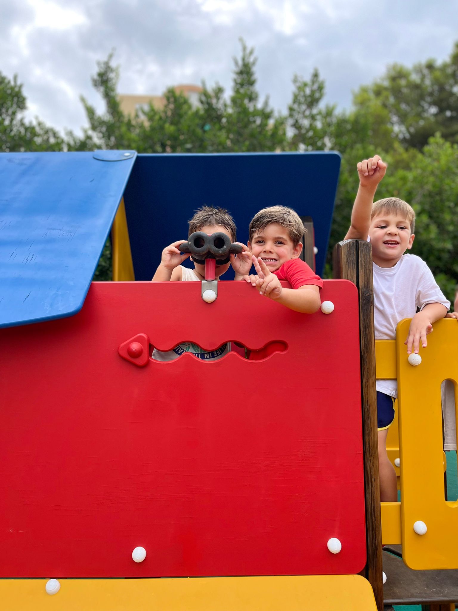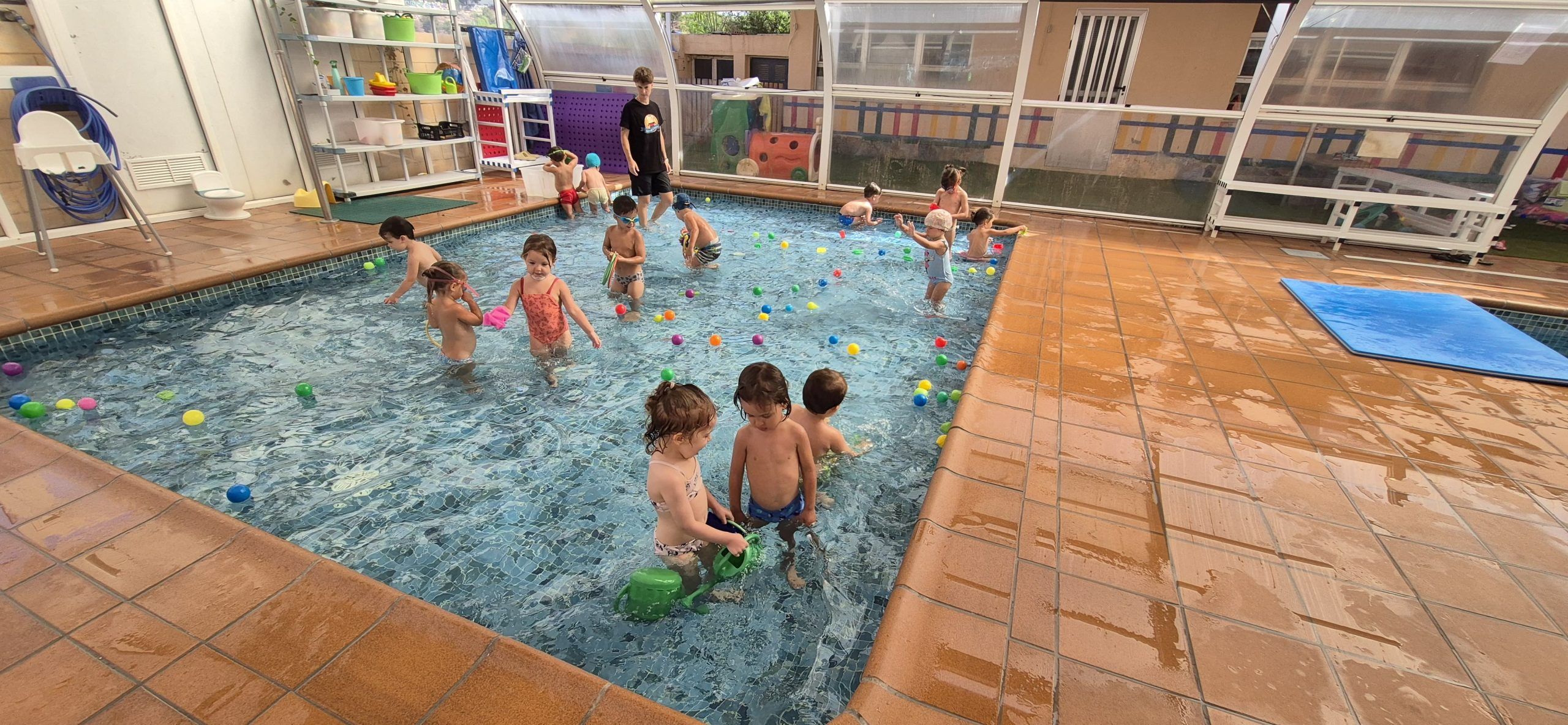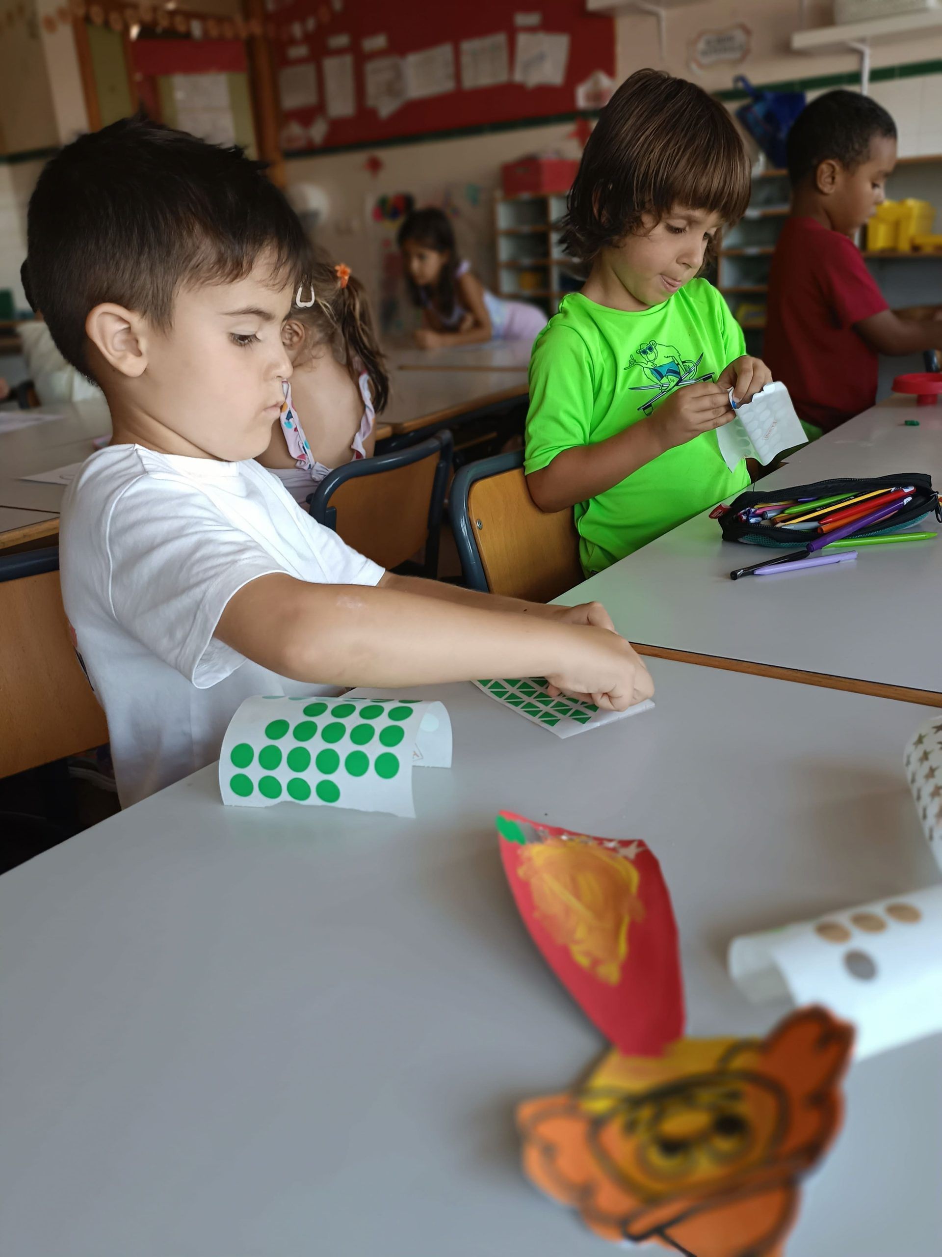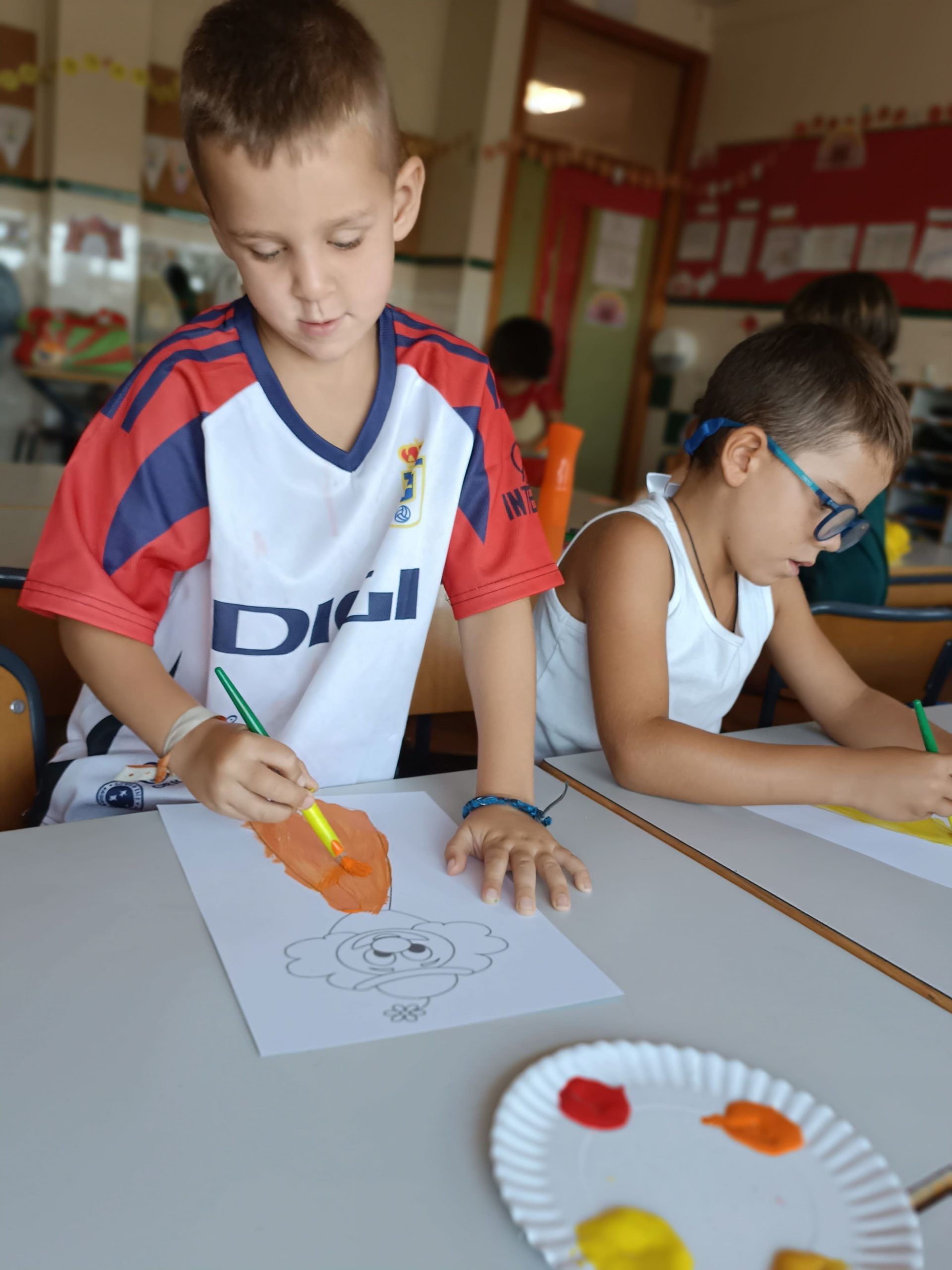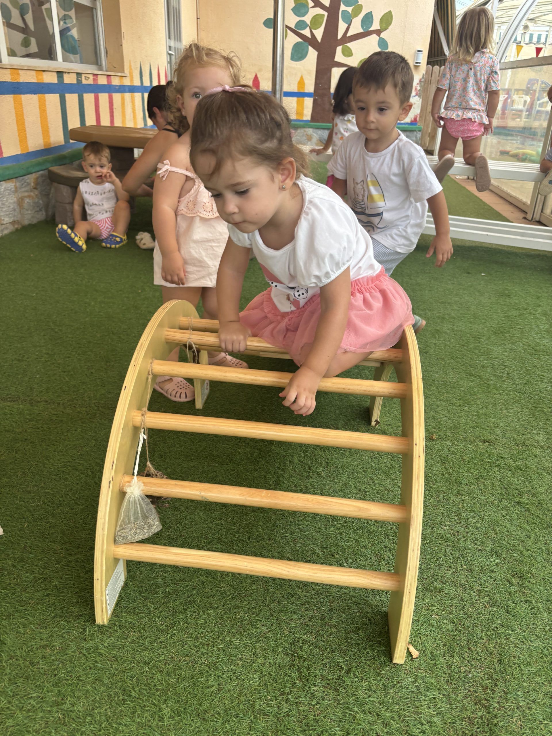 También han creado sus propias mancuernas con materiales reciclados y han experimentado con los botes del circo con los que hacen música, torres, conocen vocabulario, realizan ejercicios motrices, entre otros intereses que surgen al ser una sesión libre. Tras esto, nos refrescamos diariamente en la piscina o juegos de agua, realizamos nuestra sesión de psicomotricidad y aprendemos inglés de forma lúdica.