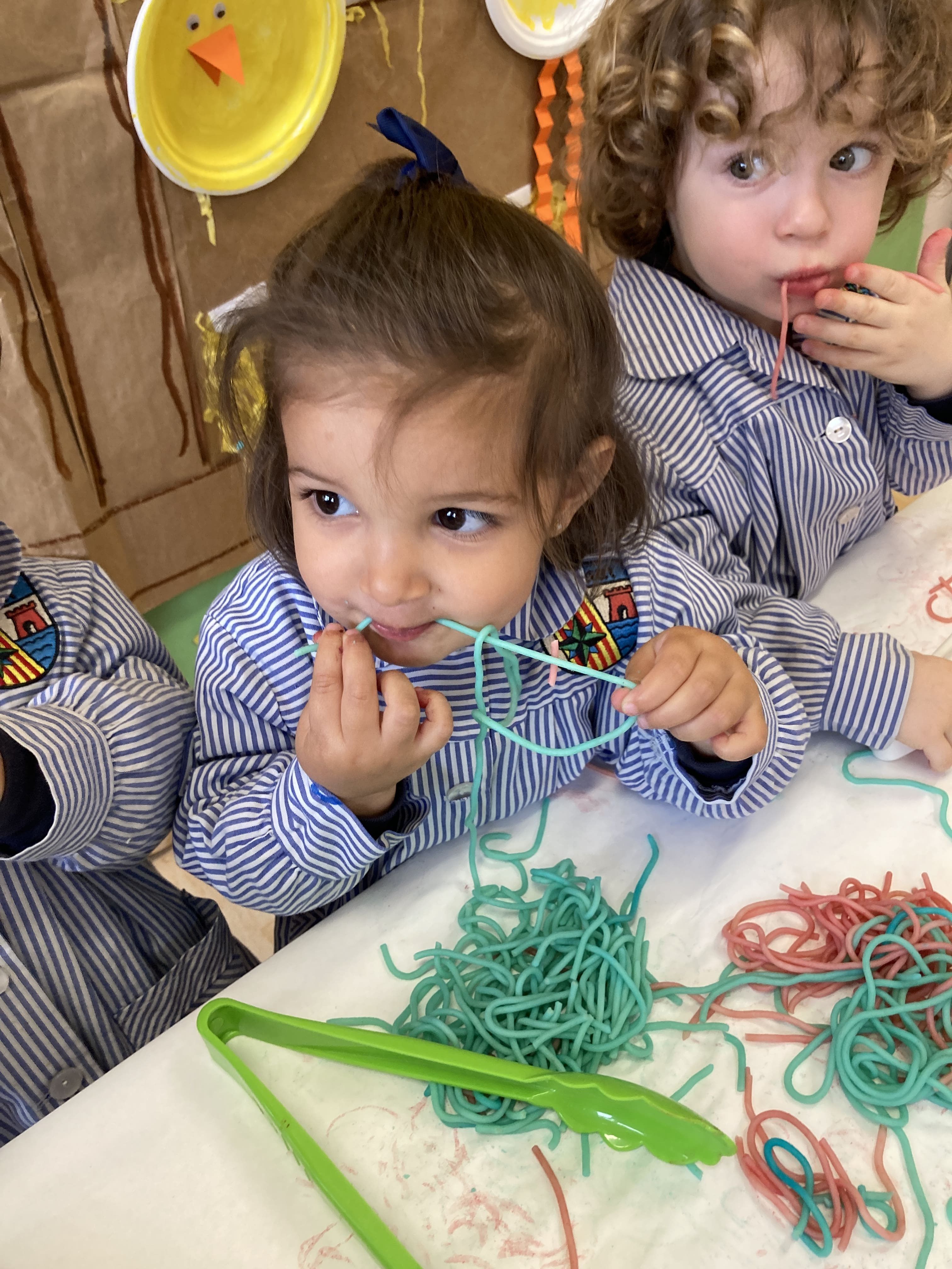 Previamente cocinados y teñidos con colorantes alimenticios, los espaguetis rojos, azules y amarillos inundaron las mesas causando una gran sorpresa a los peques de maternal.