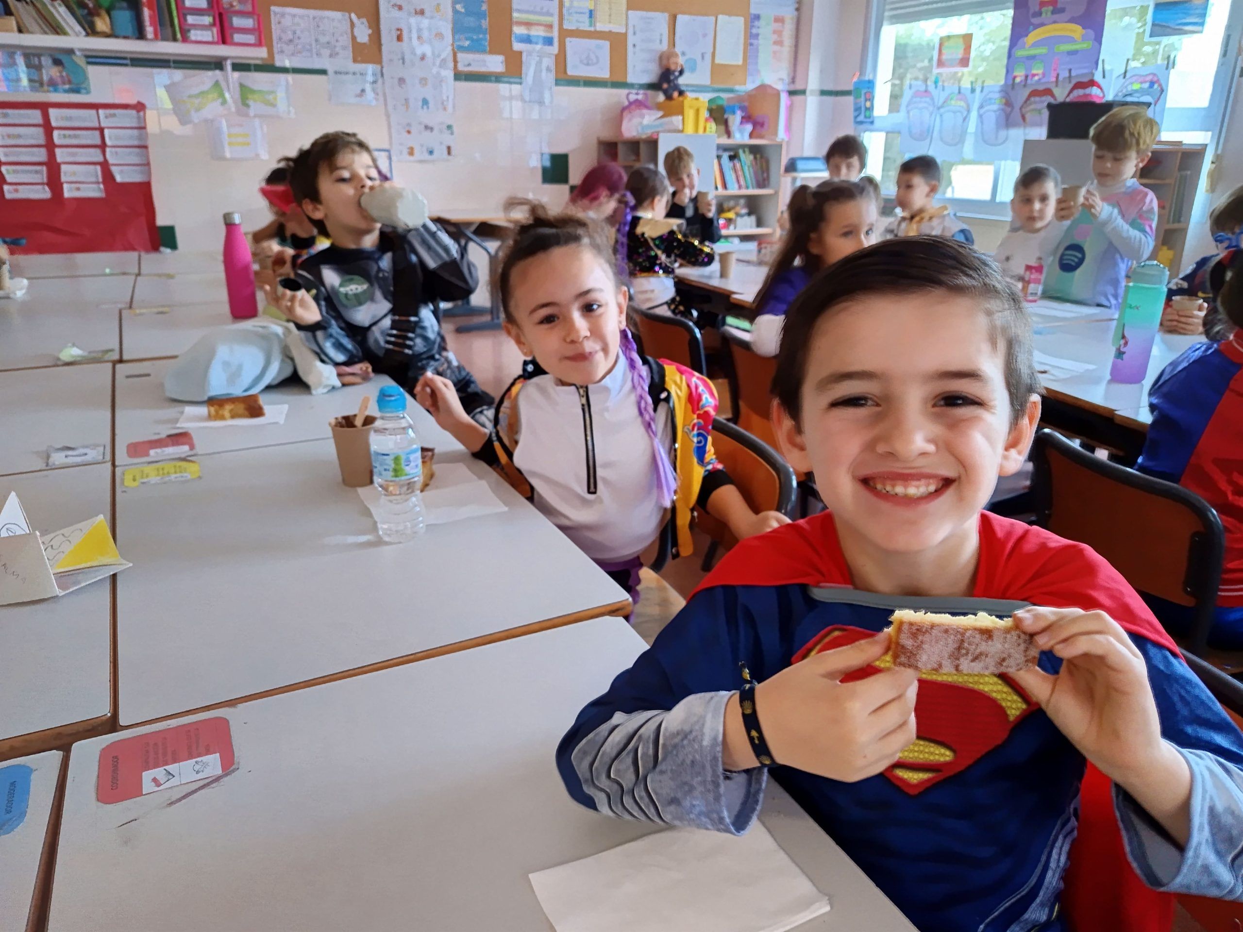 La mañana comenzó de la mejor manera posible, con un delicioso desayuno de chocolate caliente y bizcocho que preparó el cole y que disfrutaron todos los alumnos y alumnas. El aroma a chocolate recién servido llenó los pasillos mientras los niños y niñas compartían mesa y sonrisas, cargando energía para todo lo que estaba por venir.